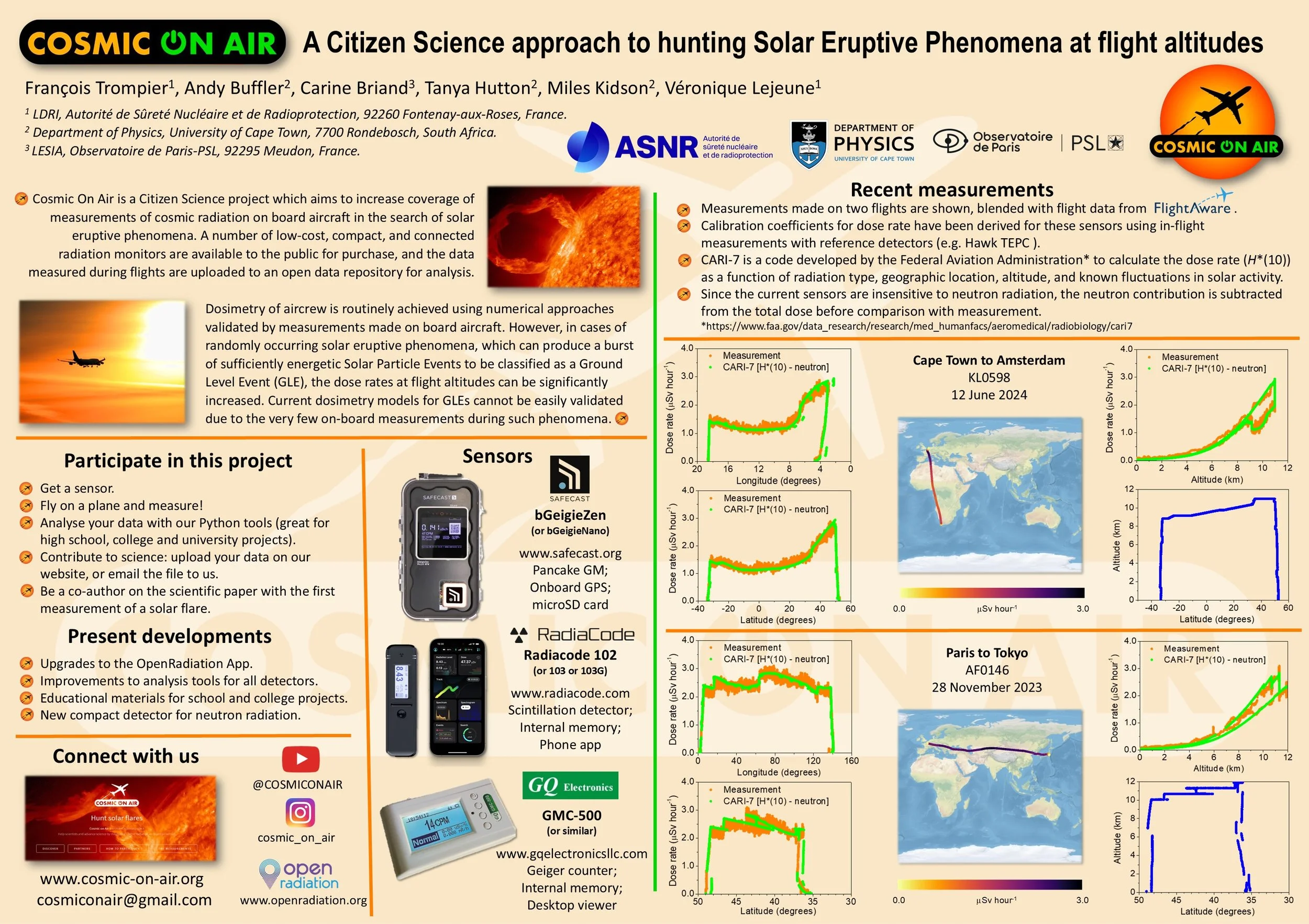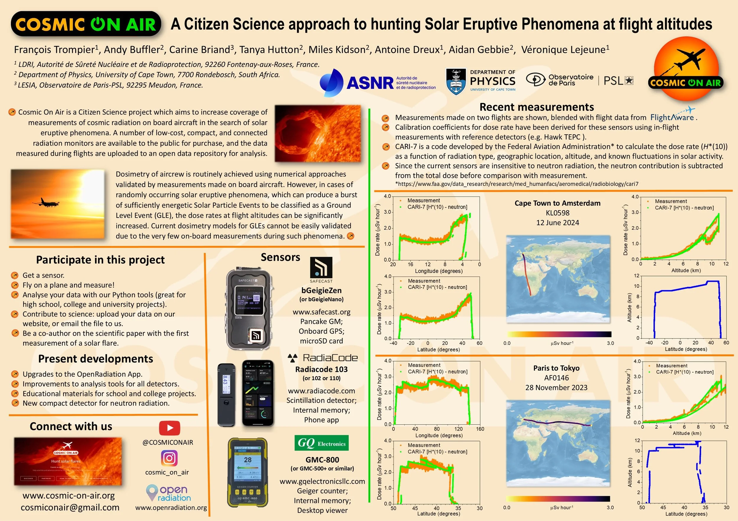 The Cosmic On Air project was presented at the International Astronomical Union (IAU) General Assemblyin Cape Town (July 2024), highlighting its role in citizen science measurements of radiation in aviation. The project brings together researchers from the Autorité de sûreté nucléaire et de radioprotection (ASNR), Observatoire de Paris and University of Cape Town.