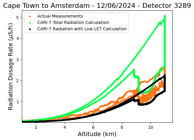 If you would like to calculate the total radiation dose of your flight, use the code below. This code plots the same graph as in the Part 1 Visualisation section. Refer back here to see how to adjust the code for your data.